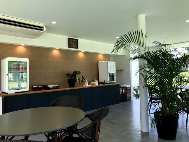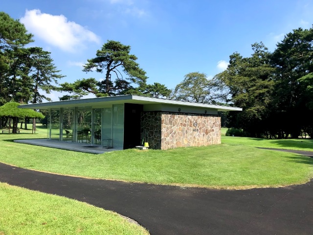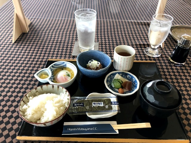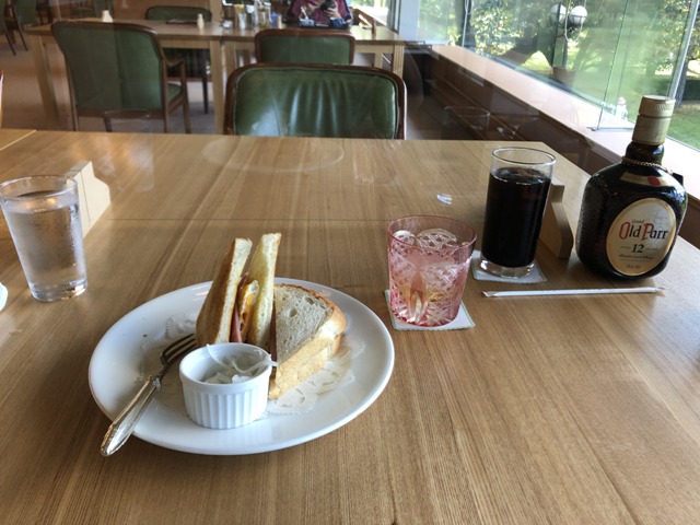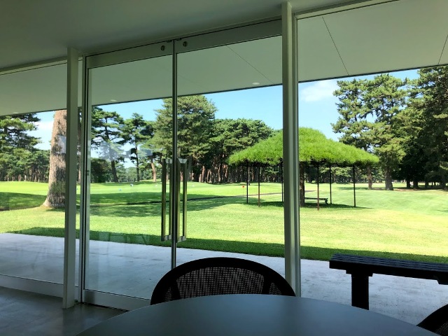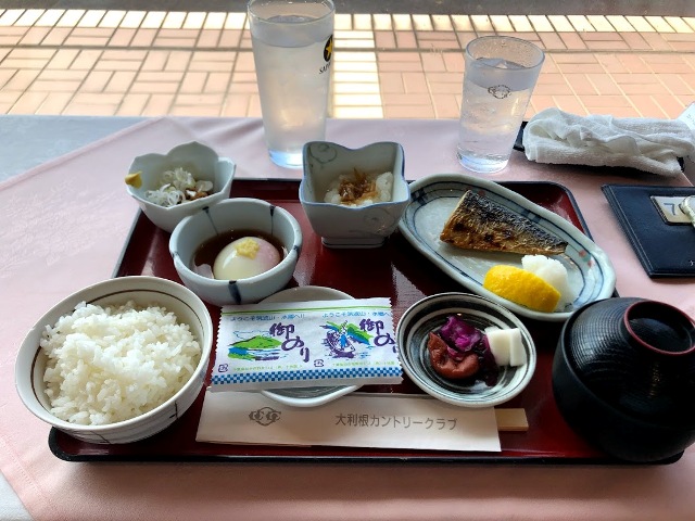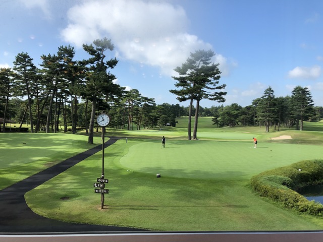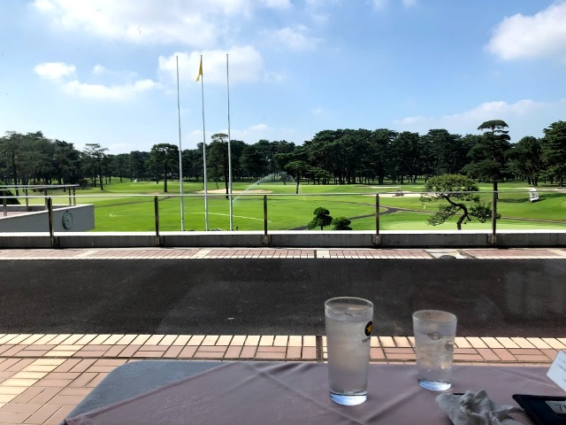 着替えてレストランへ。コロナ対応で窓際カウンターのようになっている席で朝食と芋の水割を頂きます。夏の朝、青い空、グリーン、フェアウェイ、松林がワイドに広がって景色が良いですね〜。良いなぁ大利根。いや、買えんけど。