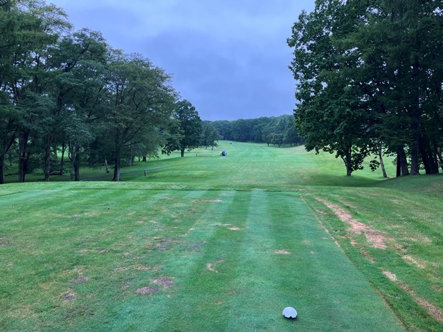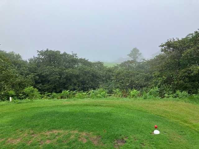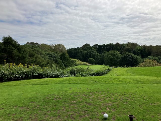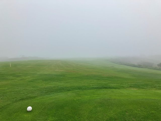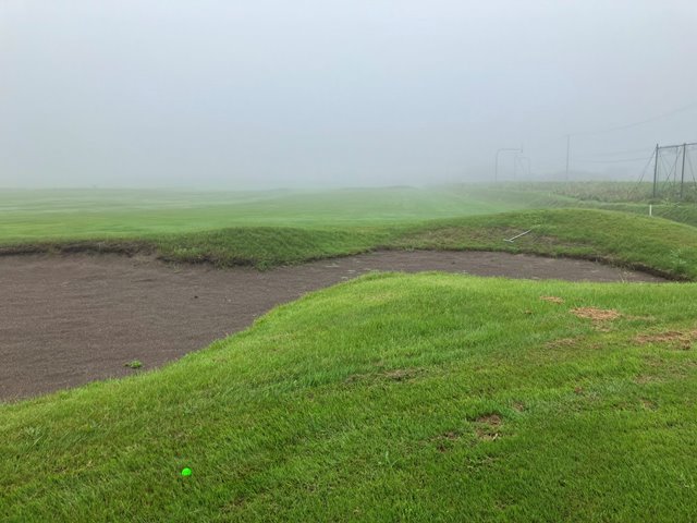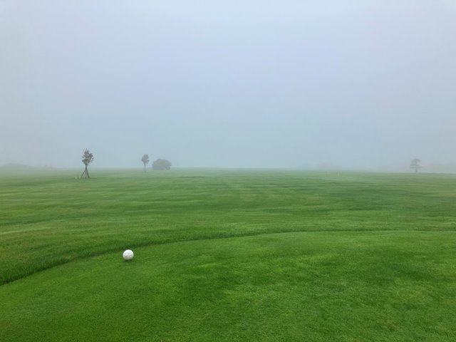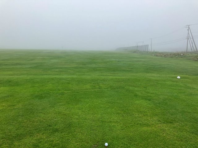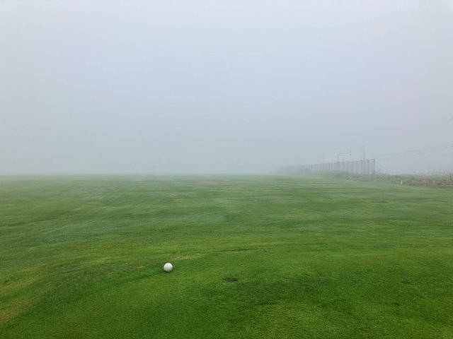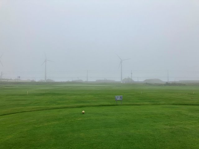 2人用のカートに乗ってスタートティーへ。ホールの説明を受けて出発します。こちらのコースは9Hを2周となります。2周目はティーマークがやや後ろに下がるのと9Hのみグリーンが2つあって最終ホールは異なるグリーンになります。さあいくぞなんですが、まったくピンが見えません。えいっとティーショットを打ってなんとか1打目のボールを探しあてたもののまだグリーンが見えません。とりあえずティグラウンドの反対方向に打っておきましょう。霧が晴れないまま、球もいくつかなくしながらなんとか1周してきました。いや確かに曲がりましたけどね。でも白杭はほぼないですし、林もないんだからあるはずだよなぁとウロウロするも見つからないことが数回、残念。2周目は別のお客さんが出発したのが見えました。私一人ではなくなったんですね。なんとなく心強い反面、前カートがどこまで進んでいるのかがわかりません。カートが見えなくなってからもしばらく霧の奥に動くものがないかを目をこらしてから打つことになります。これって飛ぶ人だと危ないかも。それでも後半はすこし霧が薄れてきたでしょうか。無事終了です。雨に降られずに済んだことを感謝しましょう。でも、これだけ視界が悪くてもスコアが昨日よりも少ないというのは良いことなのか悪いことなのか(いずれにしろ悪いから一緒だよ)。