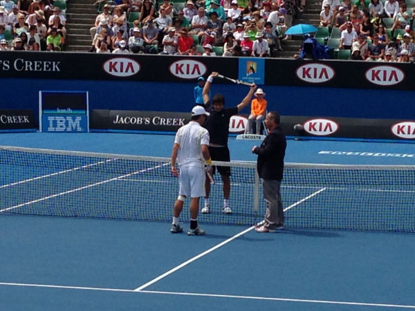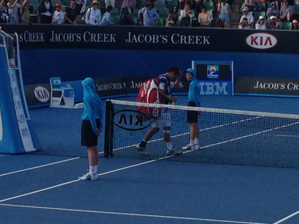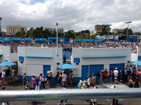試合がある2番コート入ると、あちこちから日本語が聞こえてくるので、見回してみると、メルボルン中の日本人が集まっているのか・・・と思うほど、多かったのですが、考えてみればこの試合を目当てに日本からもたくさんの人が来ているのですから、これも不思議ではないですね。
