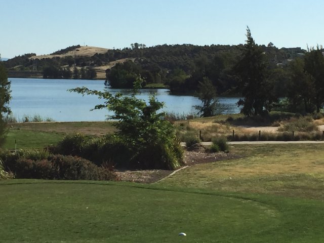 みんなで探すも結局見つからず、打ち直し。2打目は右池、砲台グリーンの左はかなり下がっていて、ややこしいホールです。私は左には落としたくないので、ピンやや右へ、リチャードもピンの右へ。ポールはピンに真っすぐ打ちましたが、やはり左にこぼれました。
