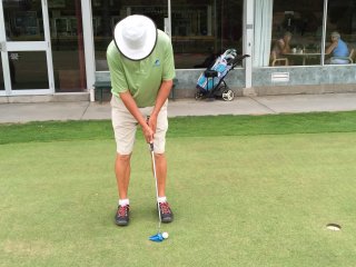 他にも知り合いがいたので、私はクラブハウスで休んでから外に出ると、まだパッティングの練習をしています。カップから2m程の線を引いて、ずっとそのラインを打っています。これから12回連続で入れて終えると言っています。1球1球ラインを合わせ、素振りをして丁寧にやっていましたが、宣言通り全て入りました。