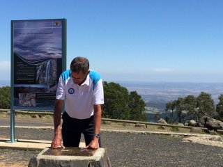 2日目練習ラウンドを終えた際、まだ午前中だったこともありますが、ゴードンが景色の良いところがあると聞いたから、見に行ってみようというので、カノボーラスという山の山頂に行って来ました。ゴルフ場から20分程度で着きましたが、車の中のエレベーションを見ると海抜1400mぐらいです。360度ぐるっと、壮大なパノラマを見ることが出来ます。写真のプレートには、それぞれ方向が示されてあり、メルボルはこの方向、シドニーはと各州の方向が刻まれています。