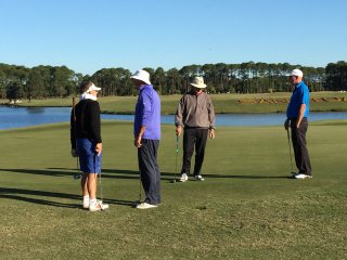 左からトム、ステーブ、ステファン、イアン。18番のグリーンでチッピングの練習で確認中。