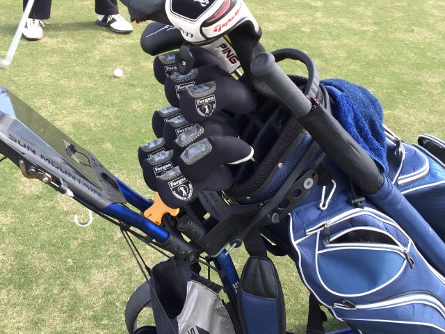 とても几帳面な男でもあります。写真を見てもらえば分かるように、打つたびにタオルで土をふき取るだけでなく、丁寧に拭きますから、キャディーバックに収まっているクラブはピカピカです。その上、アイアンのヘッドにはカバーがしてあり、ドライバーはシャフトに傷がつかないようにしているのか?ヘッドからグリップまでスッポリ収まるカバーをしています。