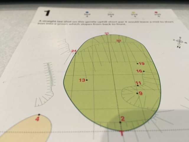 全英シニアのようなメジャーな試合になれば、写真のような、ヤーデージブックが配布されますから、グリーンの情報も出ていますが、一般の試合では、自分で作らなくてはなりません。1度の練習ラウンドですから、集める情報には限りがありますが、読む力に劣る場合、データがあるのとないのでは全く違ってくるので、私の場合、このようなものを作るようにしています。
