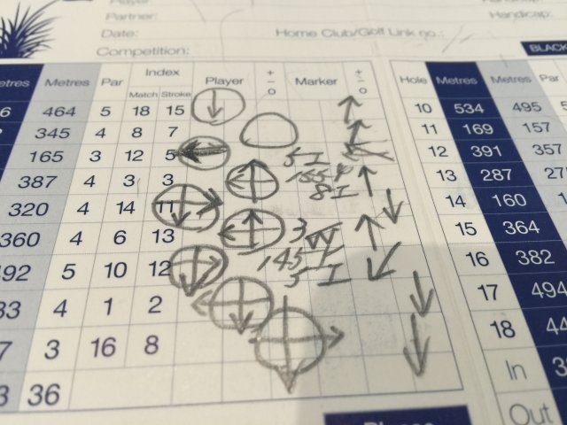 これらは、試合会場のスコアカードですが、左にグリーンの絵を描いて、ラインは縦、横に矢印を書き入れます。時間があれば、詳しいのはもっと良いと思いますが、限られた時間なので、矢印でグリーンの流れを書き込みます。最低限これを知っていれば、こちらから速い、遅いは分かるし、曲がるのかどうか迷う際は、ボールからカップに対し、仮に右から左に矢印があれば、ロングパットは勿論のこと、2mのパットでも、少なくとも右には行かない。どちらかに曲がるとすれば、左にくるのだと分かりますから、とても参考になります。