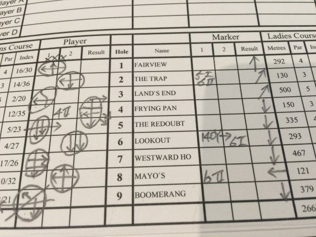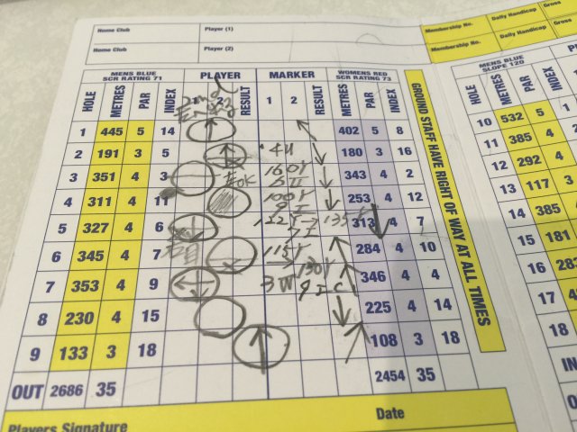 それから、これも大事なのは、距離のジャッジには風の影響が大きいので、スコアカードの右には、必ずそのホールの風向きを書いて於きます。風は毎日微妙に変わりますが、その時期、そこに吹く風には基本的にそちらに吹くという傾向はありますから、基本の風を知っておくのは大切ですし、オーストラリアは常に風が強いので、クラブ選択には欠かせません。