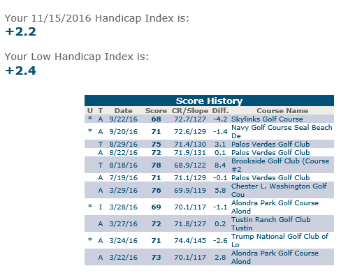 アメリカでは定期的にEmaiでこのようにデータが送られて来ますが、この表にあるように、11ラウンドしていますが、コースレーティングで72を超えているのは3つしかないし、スロープレーティングで130を超えているのも、3つしかありません。オーストラリアでは、地元ということもありますが、CRで72、Slopeで130を下回るコースではほとんどプレーをしませんから、アメリカの方が、どうしてもスコアが出やすくなります。その上、カードも全てが入るわけではありませんから、どうしてもHCは甘くなってしまいます。