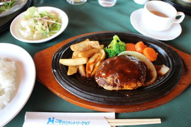 窓面から見る景色もいい感じです。昼食時はお奨めというハンバーグを食べました。いい味でした。