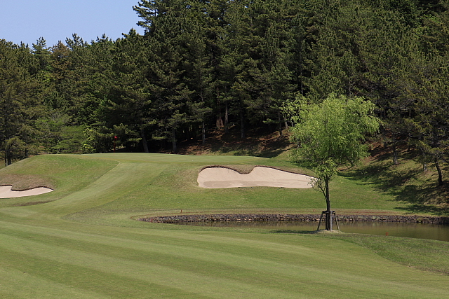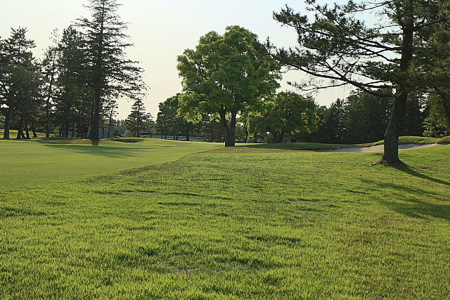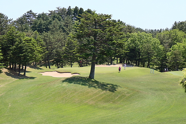 両サイドに松がたくさんあり、また FW中央やグリーン手前に大きな木があり難易度をかなりあげております。