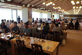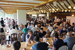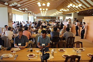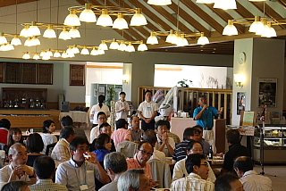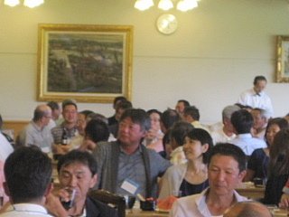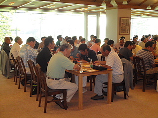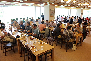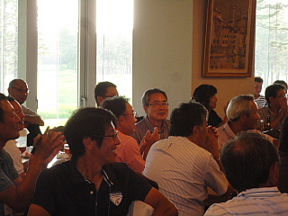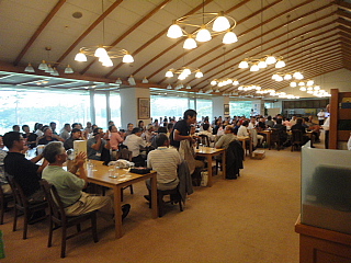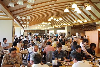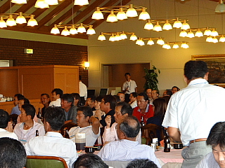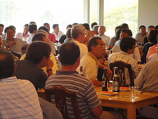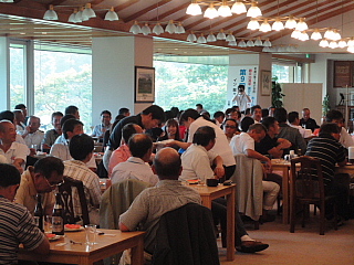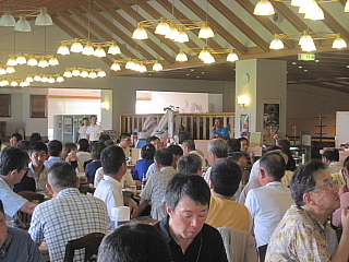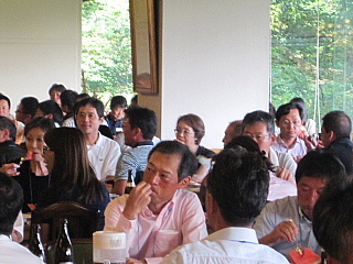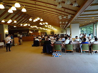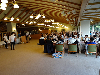 120名を超えるお客様がテーブルに並んでいます。お客様の座席配置表の作成・座席の配置等、龍ヶ崎レストランマネージャさんを中心にやって頂きました。当日にスタート変更等があったにもかかわらず、流石プロのお仕事です。テーブルの上には、冷えた飲み物と美味しそうな料理が並んでいます。