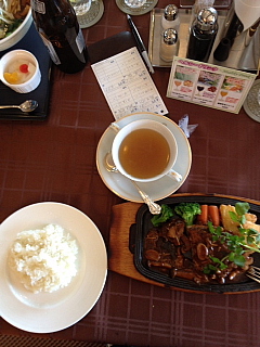 ランチタイムは45分間と、ちょうどよい時間でした。昼食はハンバーグステーキ、普通かな。朝食が600円であまりにも安くてよかったので、期待しすぎてしまいました。