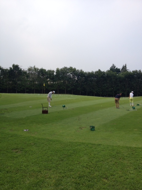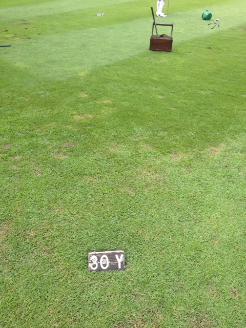 この日は40組入場という事で、若干混雑気味でした。ピンまで20y,30yという表示があり、距離感の確認が出来ます。打席練習場も一カゴ制限がかかっておりました。フラットな作りで、リアルな160Y表示、200Y表示がしてあり、こちらも十分な縦の距離感が判ります。以前はやみくもに7番アイアンなら155yは届かないとおかしいという練習の仕方でしたが、10年もゴルフ経験を重ねると、朝イチは7番アイアンで130y。そのくらいゆったりした気持ちで身体をほぐそうという意識に変わってきています。