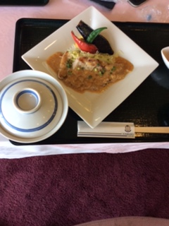 ランチは、バブリーなレストランで豚肉味噌味付けステーキ。
