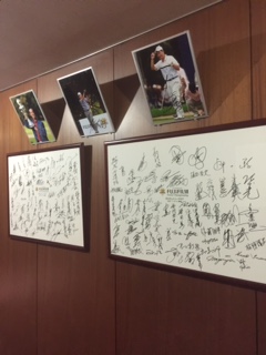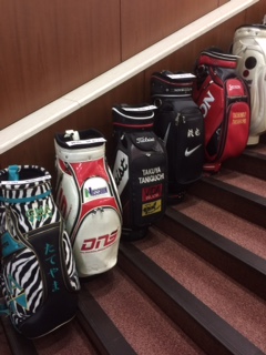 (レストラン階段にある男子ツアープロのキャディーバッグ)