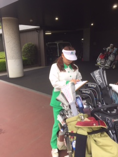 キャディーさんのユニホームは、緑と白。「よろしくお願いします」と一礼。