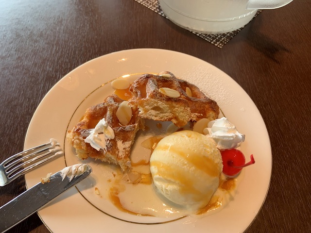 キャラメルソースのベルギーワッフルとバニラアイス。コーヒーか紅茶がセットで付きます