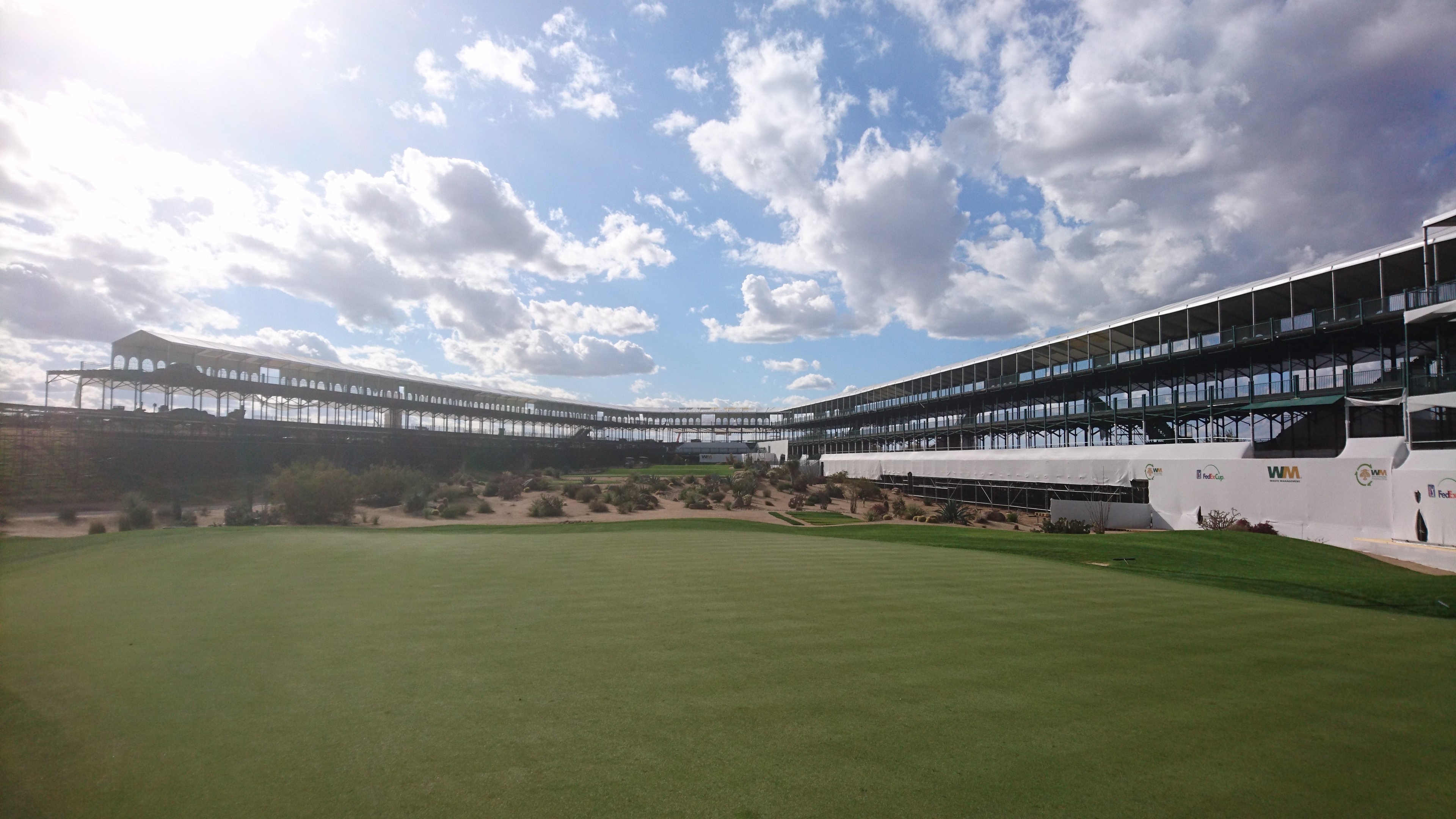 →フェニックスでは松山選手が連覇したゴルフ場をラウンド。ちょうど大会の後だったので、名物のパー3のスタジアムはそのままで、迫力満点。