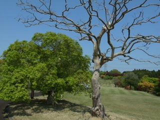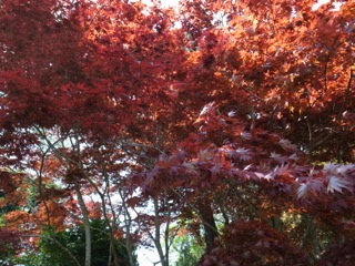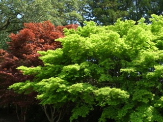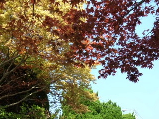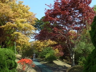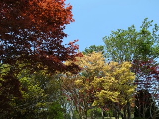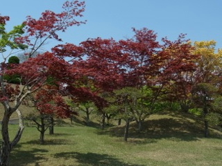 これ以上はないという晴天のもとに、春の陽を浴びて赤や黄色の葉がひときわ色鮮やかに芝生に映えます。